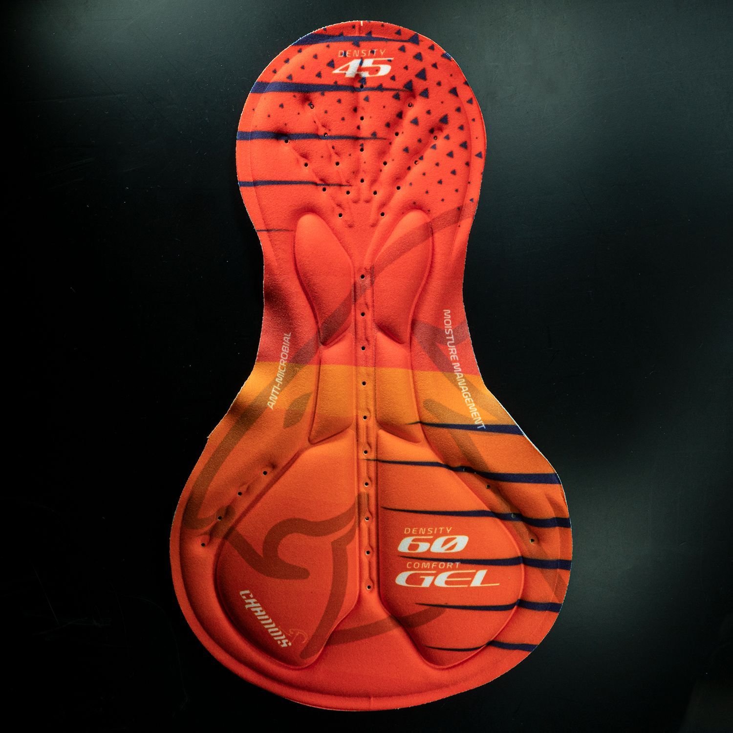 O forro Chamois PAD08, com gel de dupla densidade, garante conforto extra em pedaladas longas. Possui densidades D45 (baixa) e D60 (alta), espuma à base de poliéster e tratamento antibacteriano. O revestimento em 100% poliéster contribui para a durabilidade do produto. A linha Chamois, amplamente usada no Brasil, diferencia-se pela espuma de poliéster, garantindo maior durabilidade e mantendo a memória do forro por mais tempo, ao contrário das espumas de PU que perdem a consistência rapidamente. O painel em gel é integrado de forma suave ao forro, proporcionando maior conforto ao atleta.